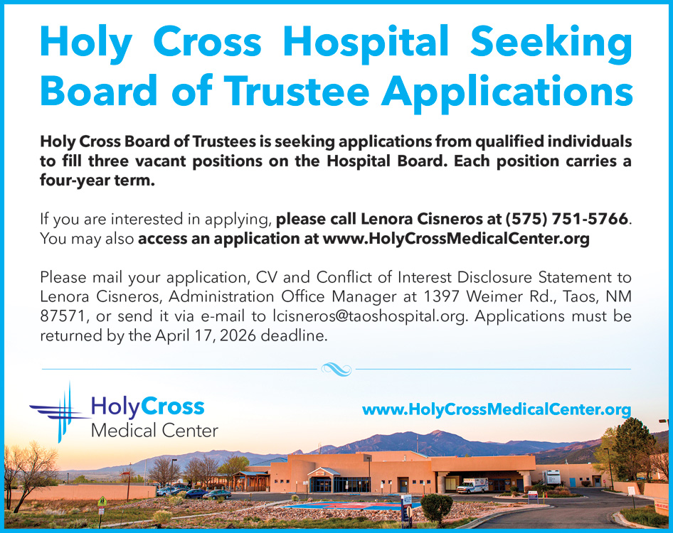 Early voting runs from October 7th through November 1st at the Taos County Courthouse and Election Day is November 4th. All county residents are eligible to vote on the mill levy. Kiser concluded, “The levy is, at its heart, an investment in the community’s health and in the future of Holy Cross Hospital.”