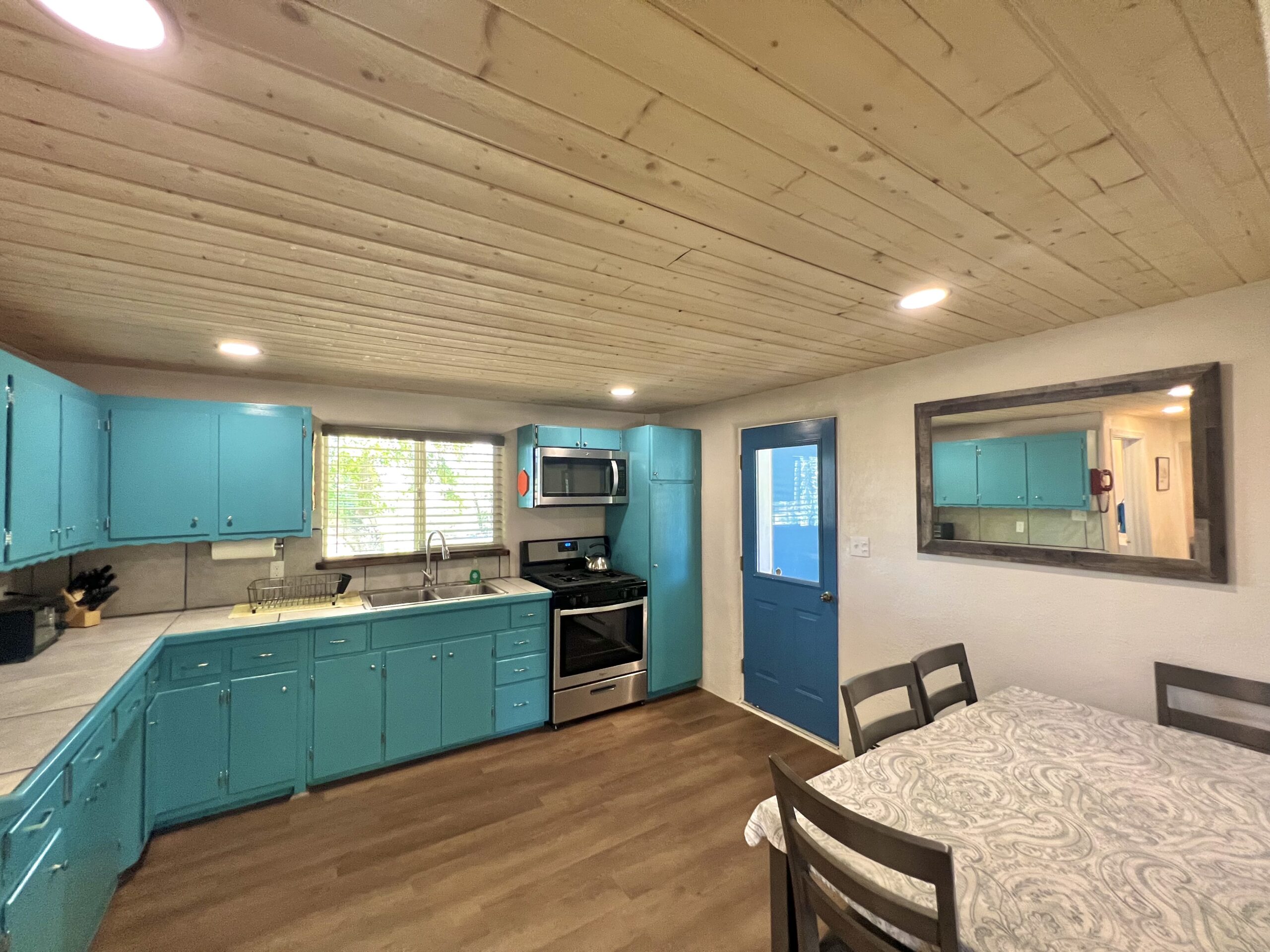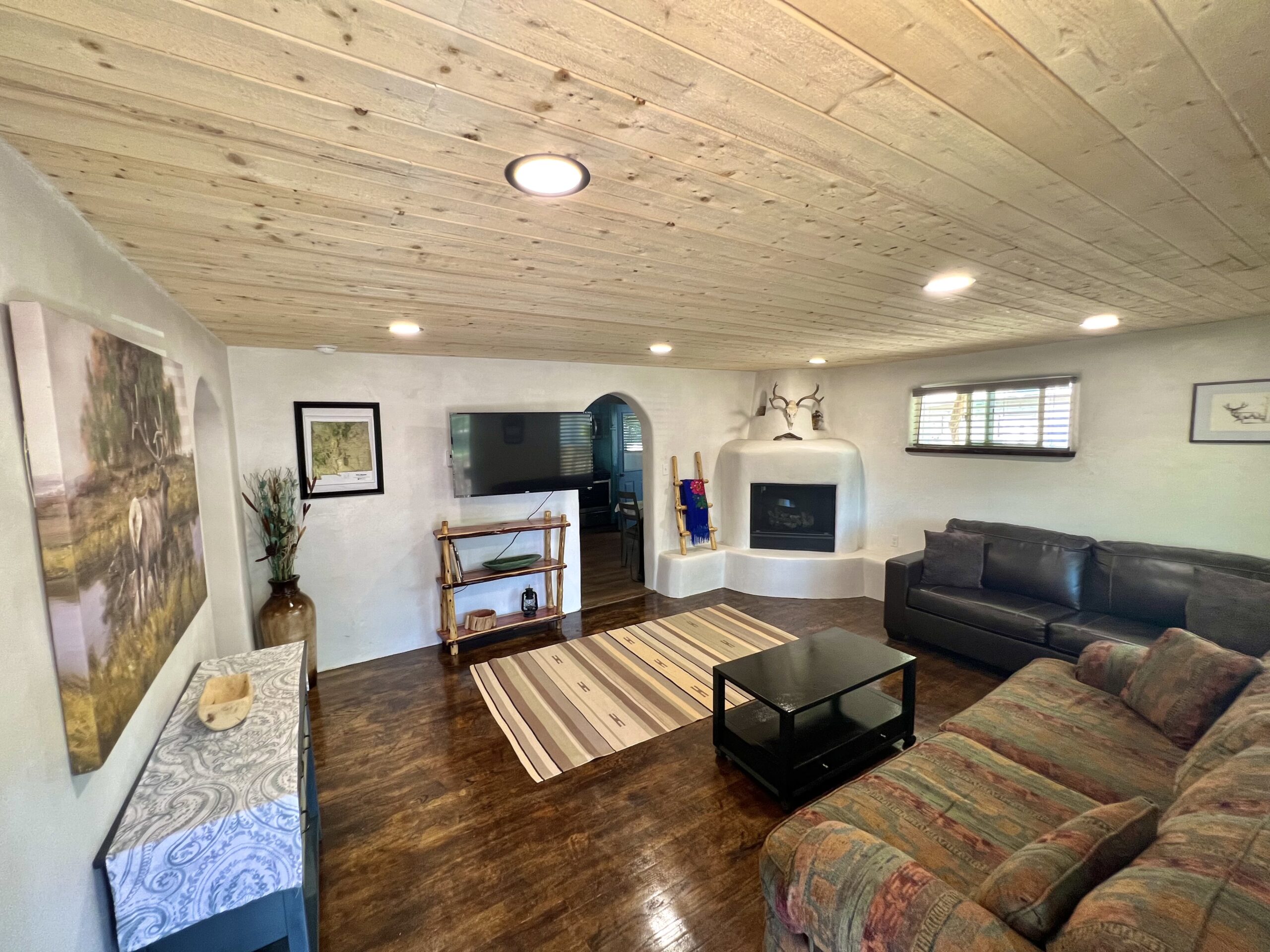 A 2 bedroom, 1 restroom with tub and shower. Free standing house. Natural Gas, Community water, Kit Carson Internet. Property is on 1 acre, 100 yards from Paseo del Pueblo Sur. The property is surrounded by fence and there is an automated gate at the driveway entrance. There are 2 other units on the property. The Casita has baseboard heating, a gas fireplace as well as air conditioning. There is a Fridge with Freezer. Gas stove and oven with over the range microwave. No dishwasher. A slate porch with table and chairs faces the road. There is a barbecue area off the porch with a fire pit. The house has been recently renovated and is completely furnished.