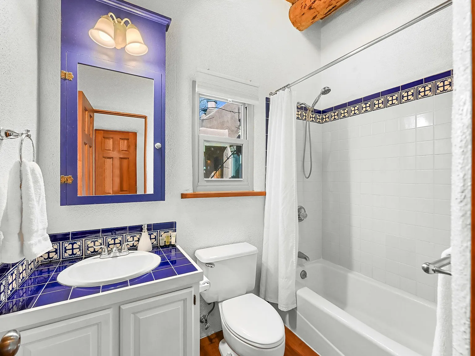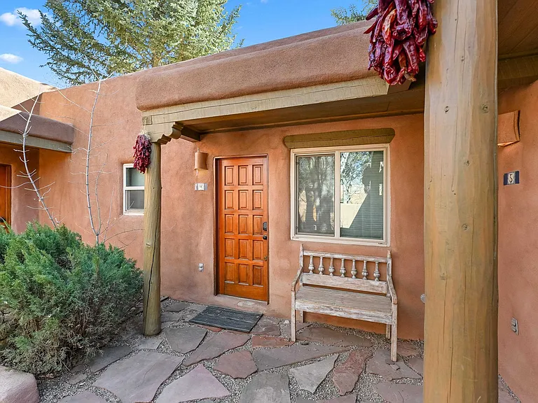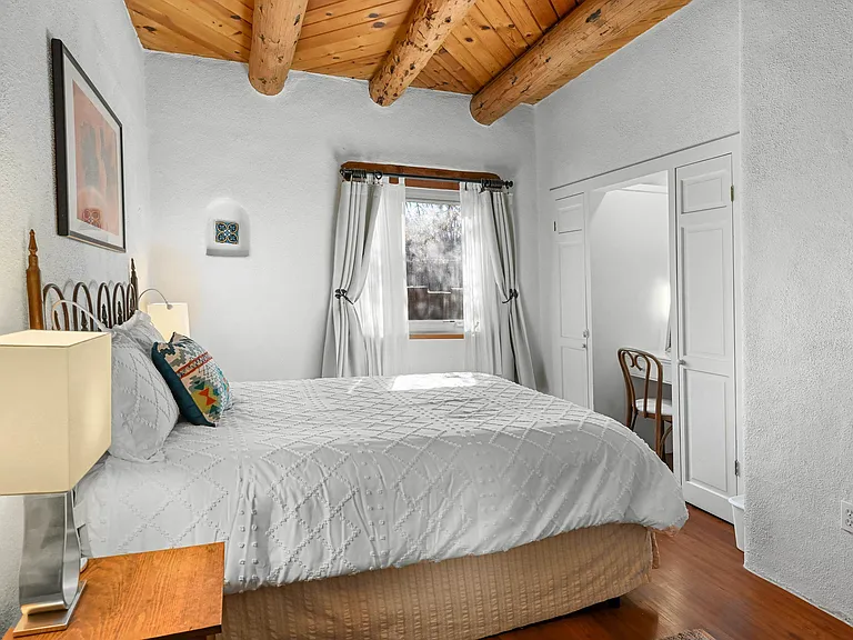 Tucked within a gated courtyard of the La Buena Vida condominium community, Cottonwood #4 offers classic Taos character in an exceptionally convenient location just moments from the historic Taos Plaza and Kit Carson Park. This thoughtfully maintained one-bedroom, one-bath residence offers approximately 544 square feet of comfortable living, filled with natural light and authentic Southwest details. High ceilings with hand-hewn vigas, a traditional kiva fireplace, and pueblo-style architectural elements create a warm sense of place that feels distinctly Taos. The efficient floor plan makes excellent use of the space, with an open living area, a well-appointed kitchen, and a comfortable bedroom with generous storage. Lovingly cared for by the current owner, the home is move-in ready while retaining the charm and character that define the community. La Buena Vida is known for its lush, well-tended grounds and mature shade trees, creating a peaceful setting behind its secure courtyard entrance. From here, some of Taos’ favorite restaurants, coffee shops, galleries, and local events are just a short stroll away. Whether as a full-time residence, weekend retreat, or long-term investment, Cottonwood #4 offers an inviting opportunity to enjoy life in the heart of Taos.
