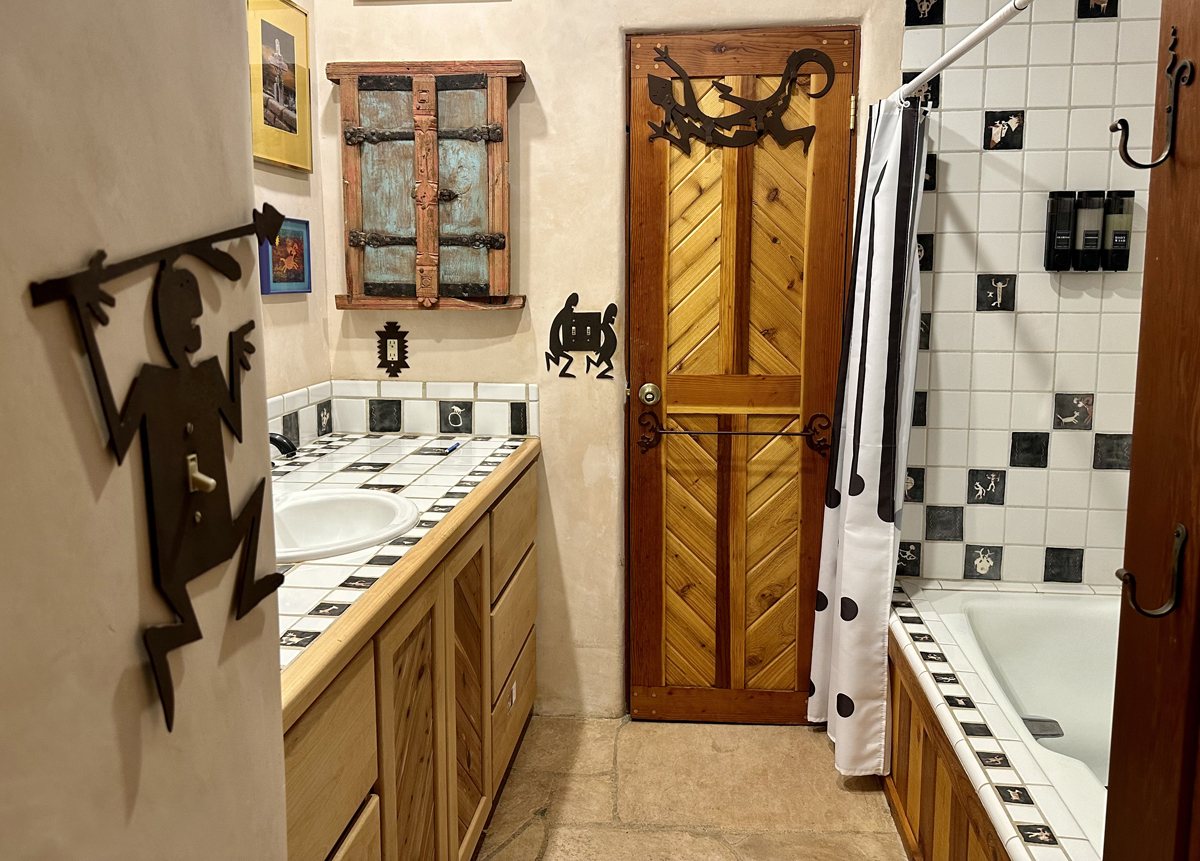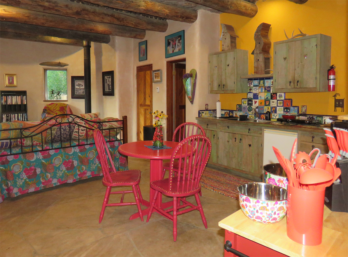 A Wildflower Retreat is a beautiful, quiet space just outside the Town of Taos in a rural setting, Located on 2 acres down a dead end road in the Canon Heights area with views of Taos Mountain outside your great room window. Filled with artistic creations,, glorious sunsets, greenery, hiking trails and gardens. Perfect for a solo writer, traveling medical folks and travelers who wish for longer stays. The ceilings are graced with traditional vigas and latillas. Thick adobe walls keep the place cool in summer and warm in winter and provide a great sound barrier. The unit is heated by radiant heat running under the flagstones and cherry wood floors. The unit is 572 square feet including a private entrance, mud room, one bedroom, extra toilet closet and a large full bathroom with shower/bath combination. There is a modern kitchenette with cookware including a Breville counter top convection oven. Pots and pans, silverware, dishes bedding and towels are included in the furnishings. All utilities are included in the price including Verizon high speed internet. I would love to welcome your beasties but because I have three of my own, I have to decline pets to keep the peaceful atmosphere we all desire. Parking is easy as there are two designated spaces next to the unit. I will be housed in the adjacent part of the house, separated by an impenetrable turquoise wood door, but I spend most of my time in a different studio at the back of the property.