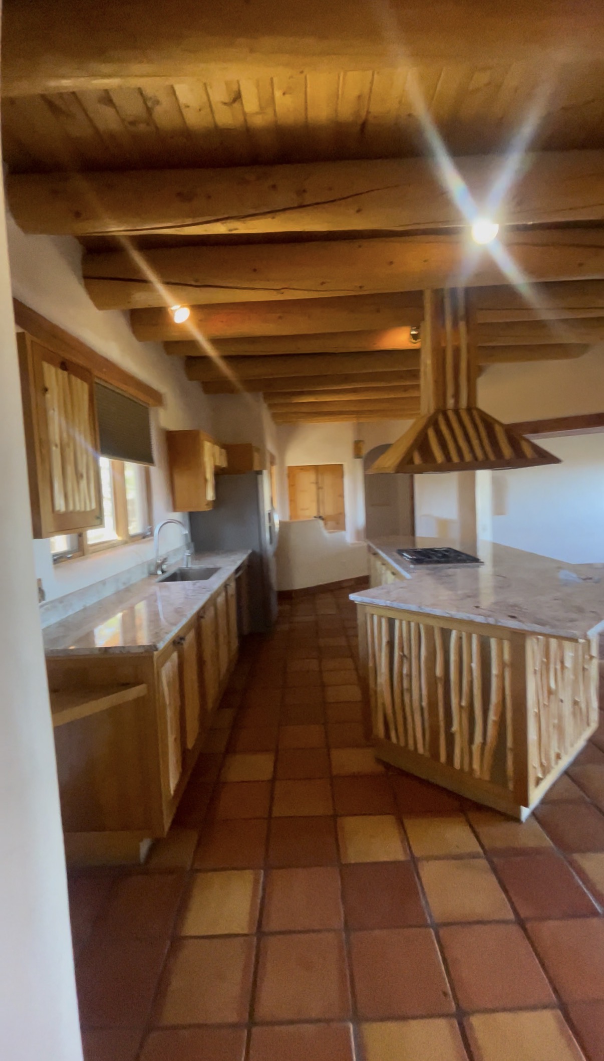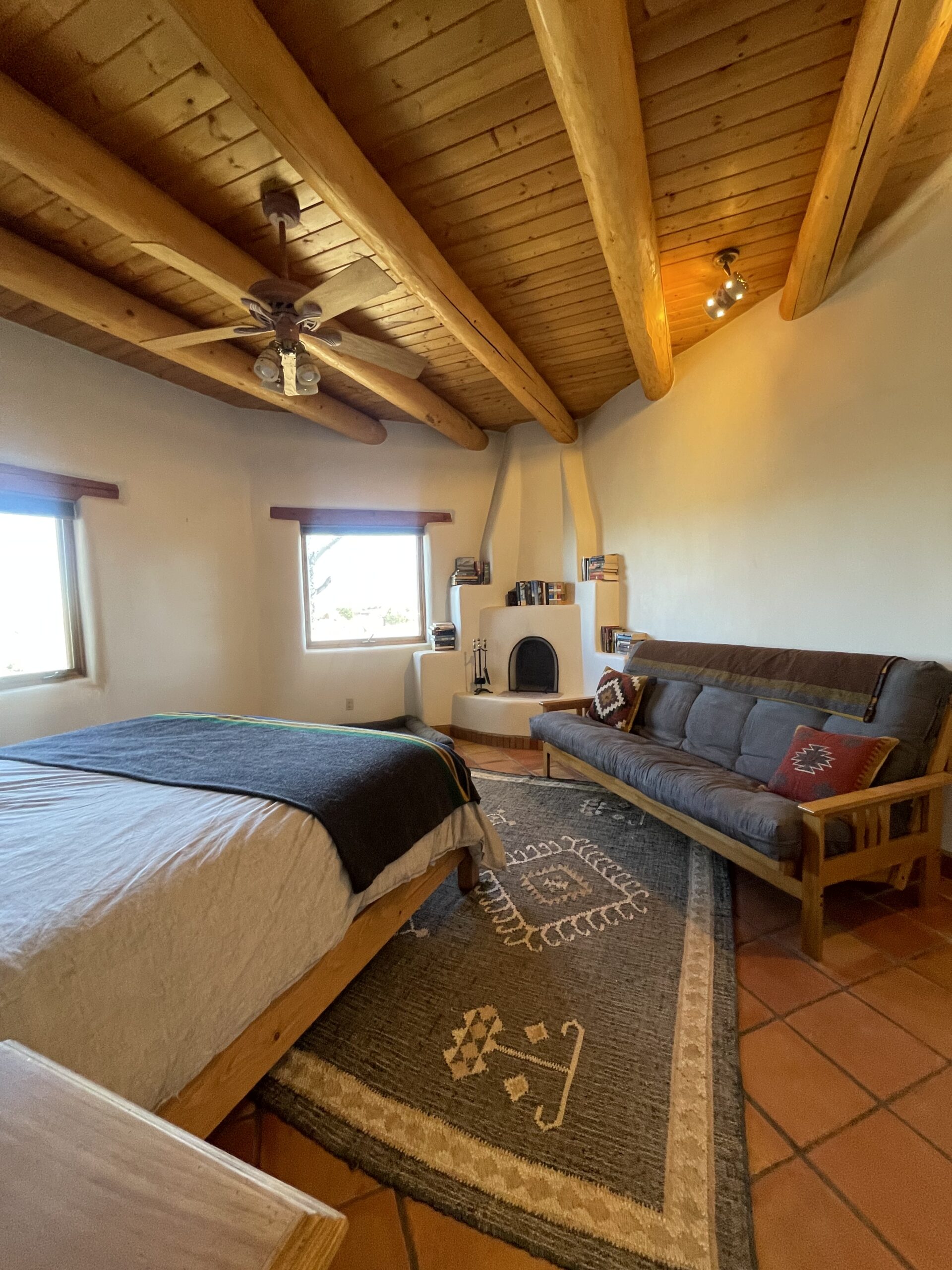 The large living area is filled with natural light and anchored by a charming kiva-style fireplace, creating a perfect space to relax or entertain. High ceilings with wood beams and ceiling fans add to the airy, comfortable atmosphere.